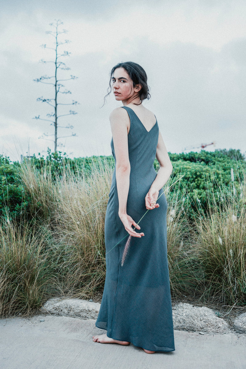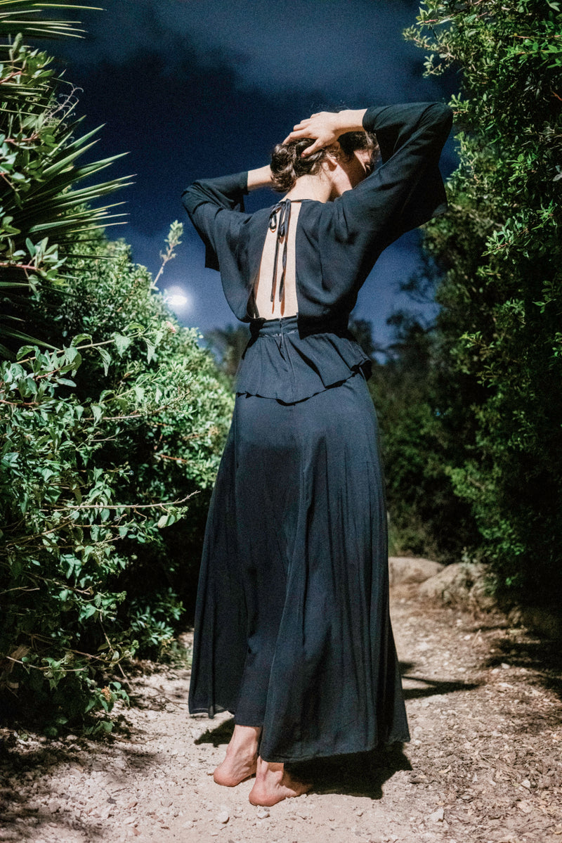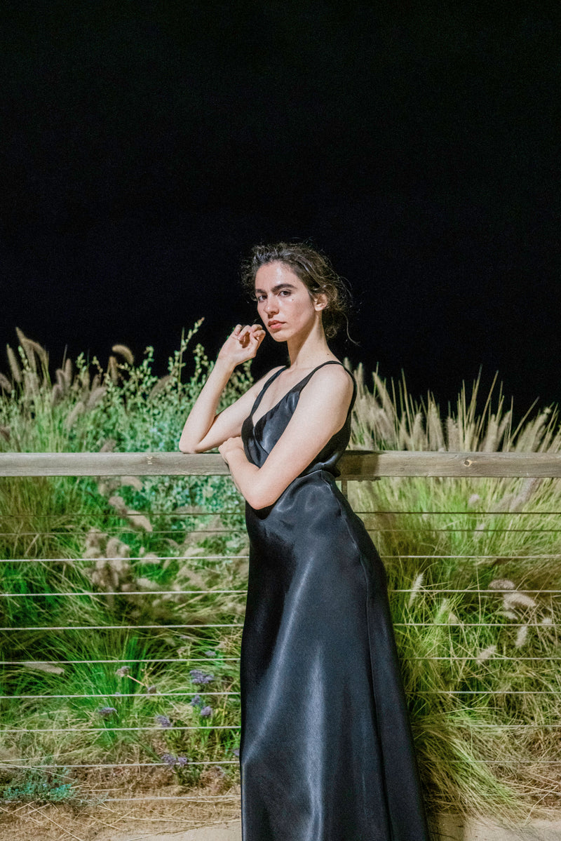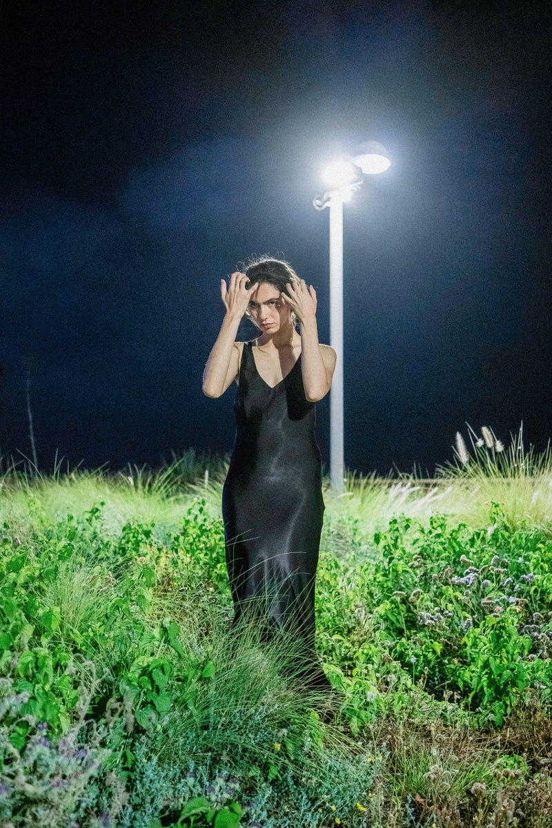 During the summer of 2023 I spent many nights wandering around the city until dawn. I got to walk among the restless and observe them under the moonlight. At times, their expressions were filled with wonder and joyful little smiles, their strides almost floating; other times, their eyes seemed somber and powerful, and their footsteps heavy; and sometimes their gazes hinted at an imaginary inner world while their bodies moved around slowly in the physical world surrounding them. This small collection of dresses was inspired by these nights. Each dress tells a different story and has a different character, like the nocturnal figures I had walked among. Naturally, we shot the collection while roaming Tel-Aviv's Independence Park at night.