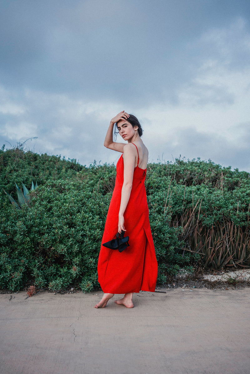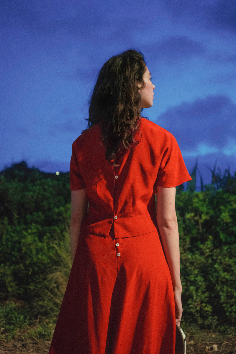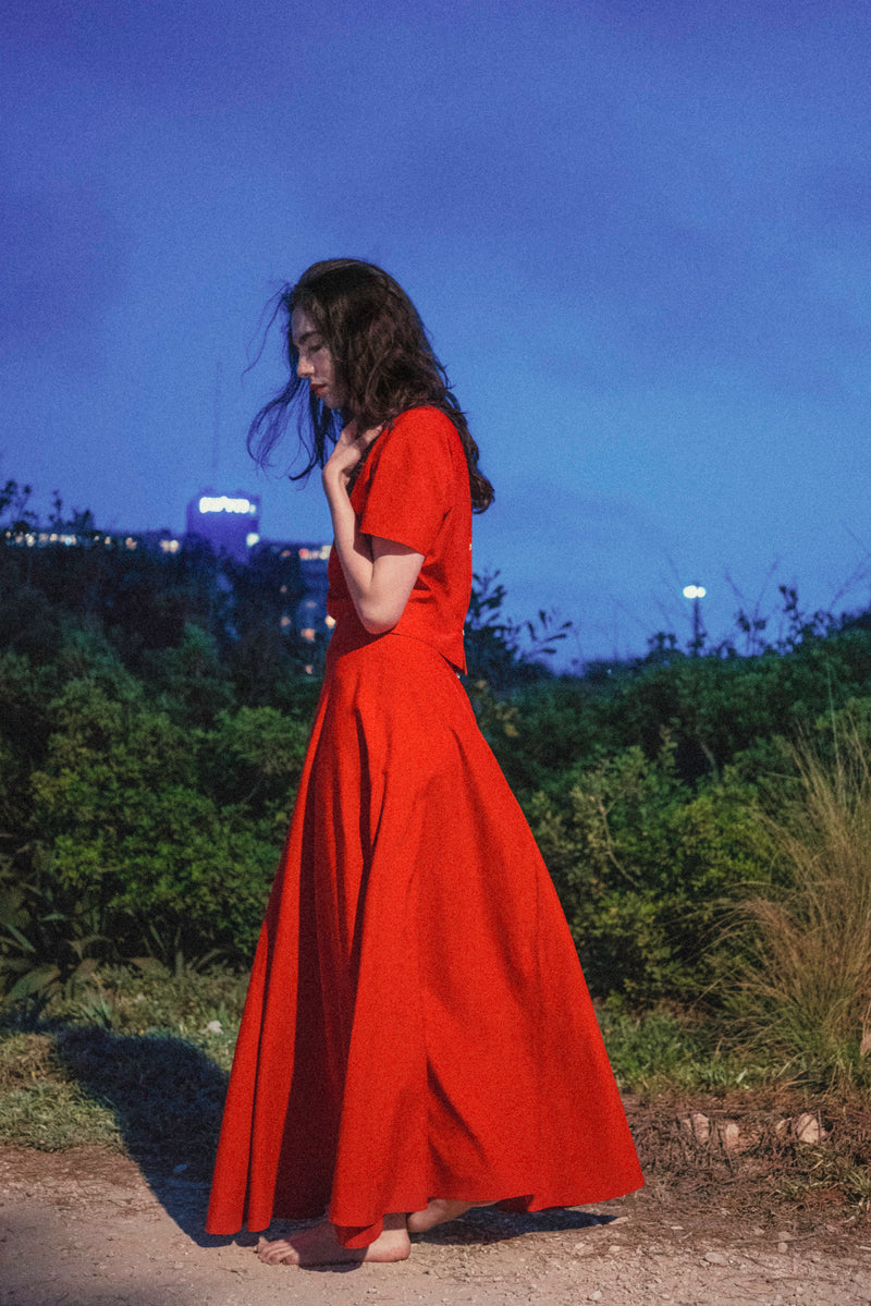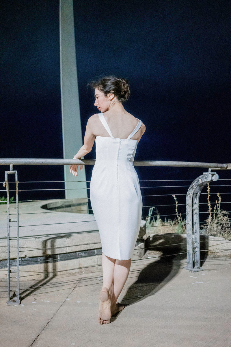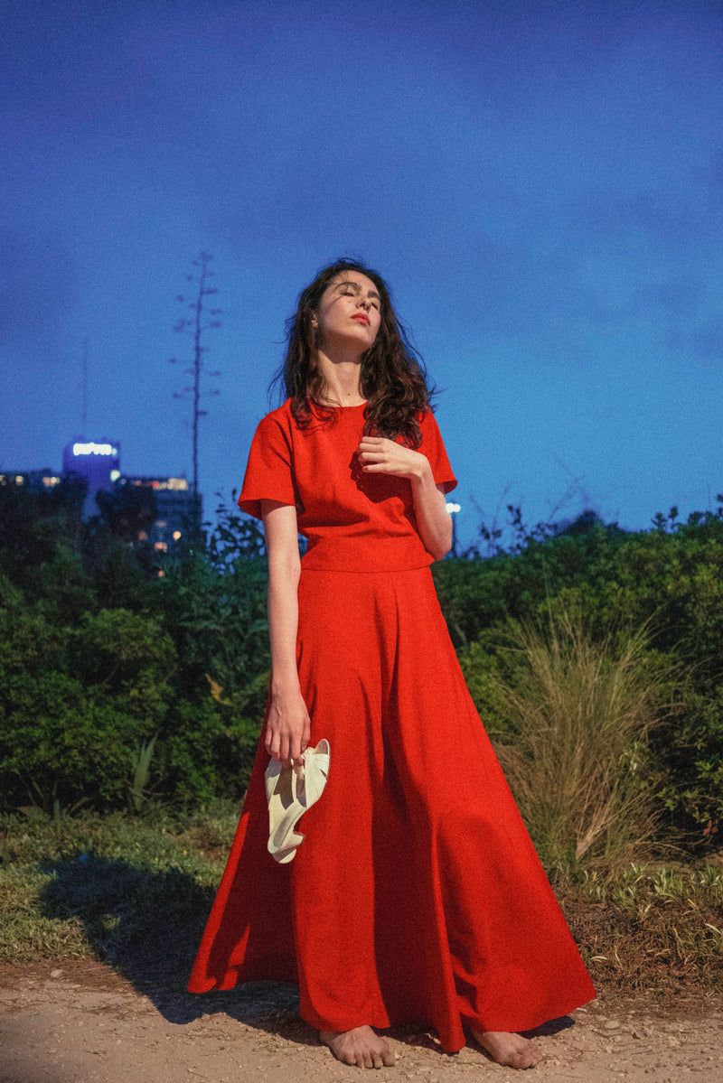 During the summer of 2023 I spent many nights wandering around the city until dawn. I got to walk among the restless and observe them under the moonlight. At times, their expressions were filled with wonder and joyful little smiles, their strides almost floating; other times, their eyes seemed somber and powerful, and their footsteps heavy; and sometimes their gazes hinted at an imaginary inner world while their bodies moved around slowly in the physical world surrounding them. This small collection of dresses was inspired by these nights. Each dress tells a different story and has a different character, like the nocturnal figures I had walked among. Naturally, we shot the collection while roaming Tel-Aviv's Independence Park at night.