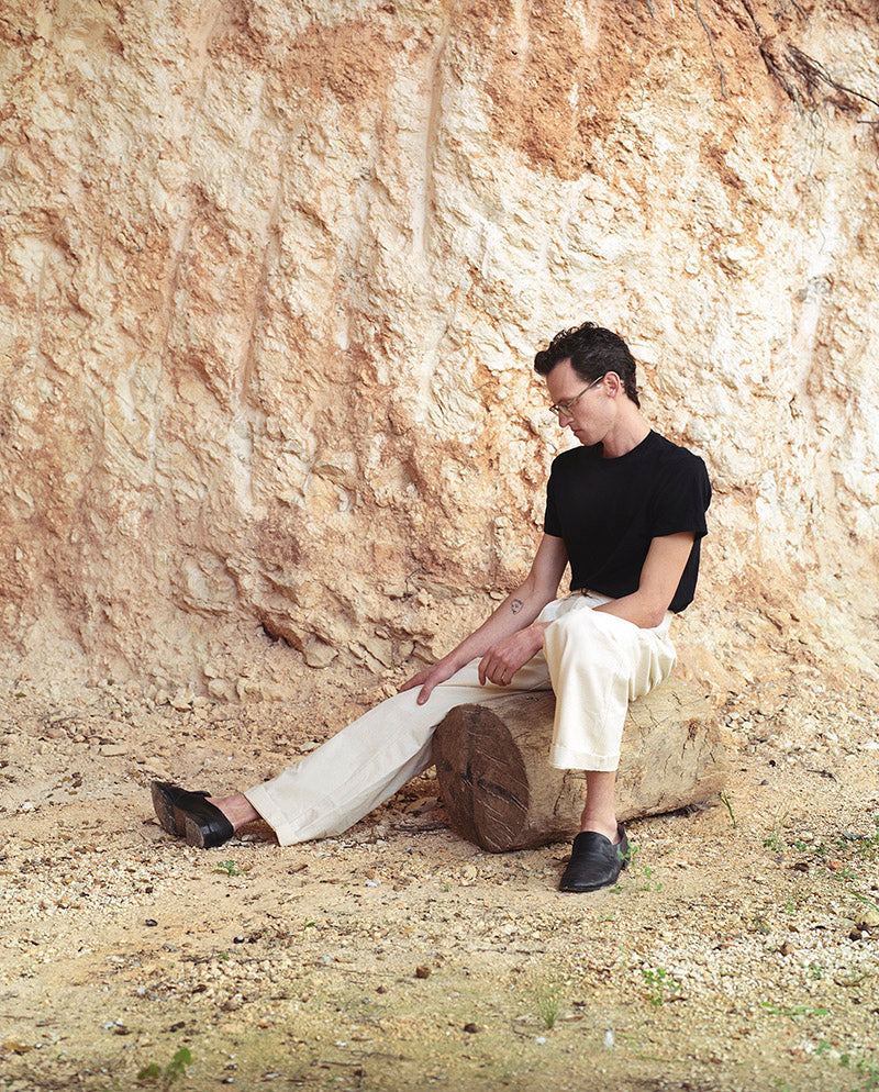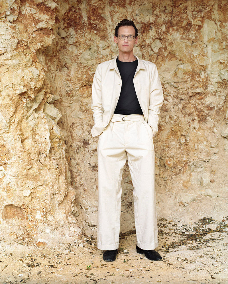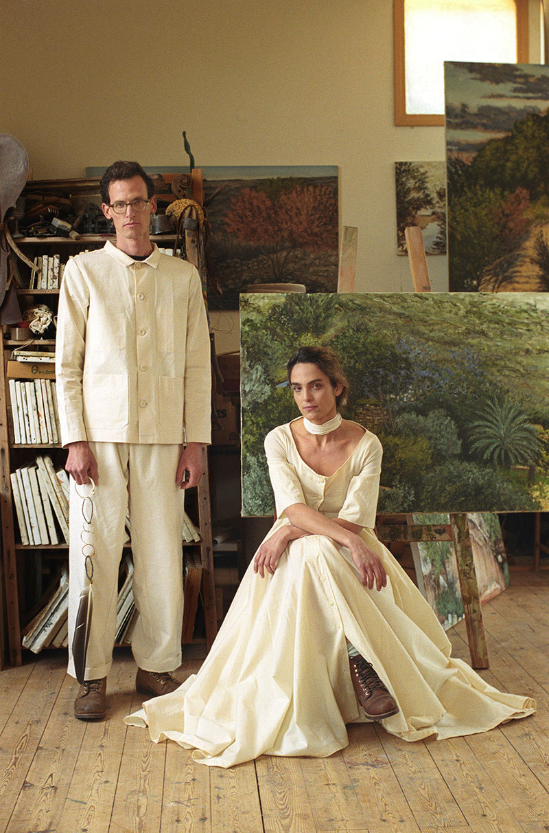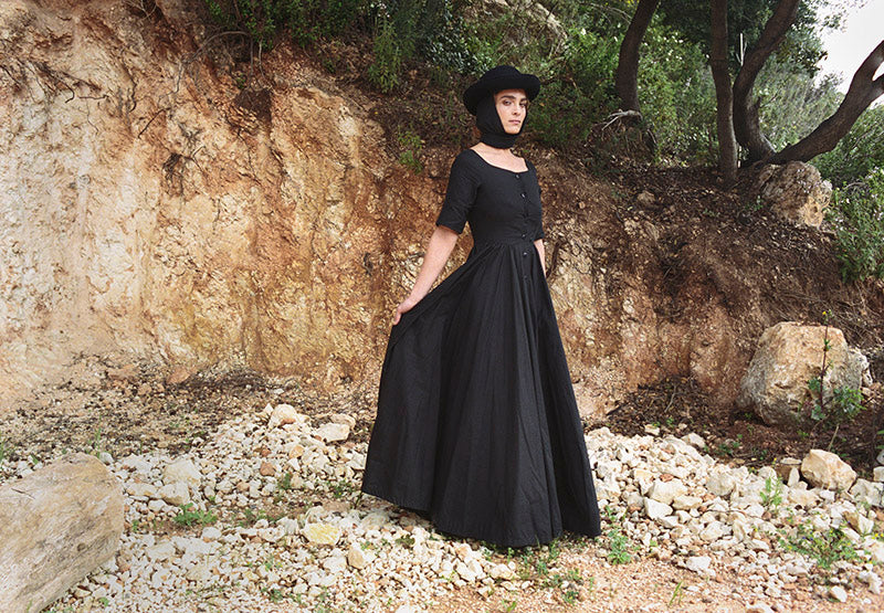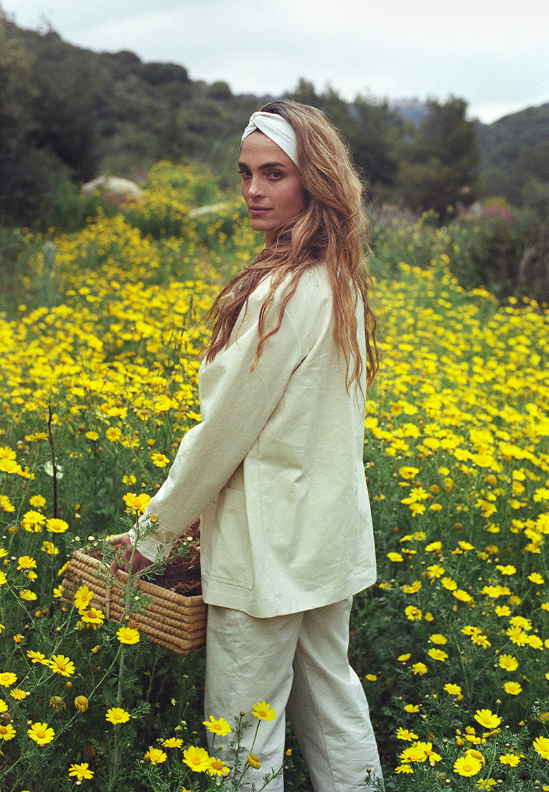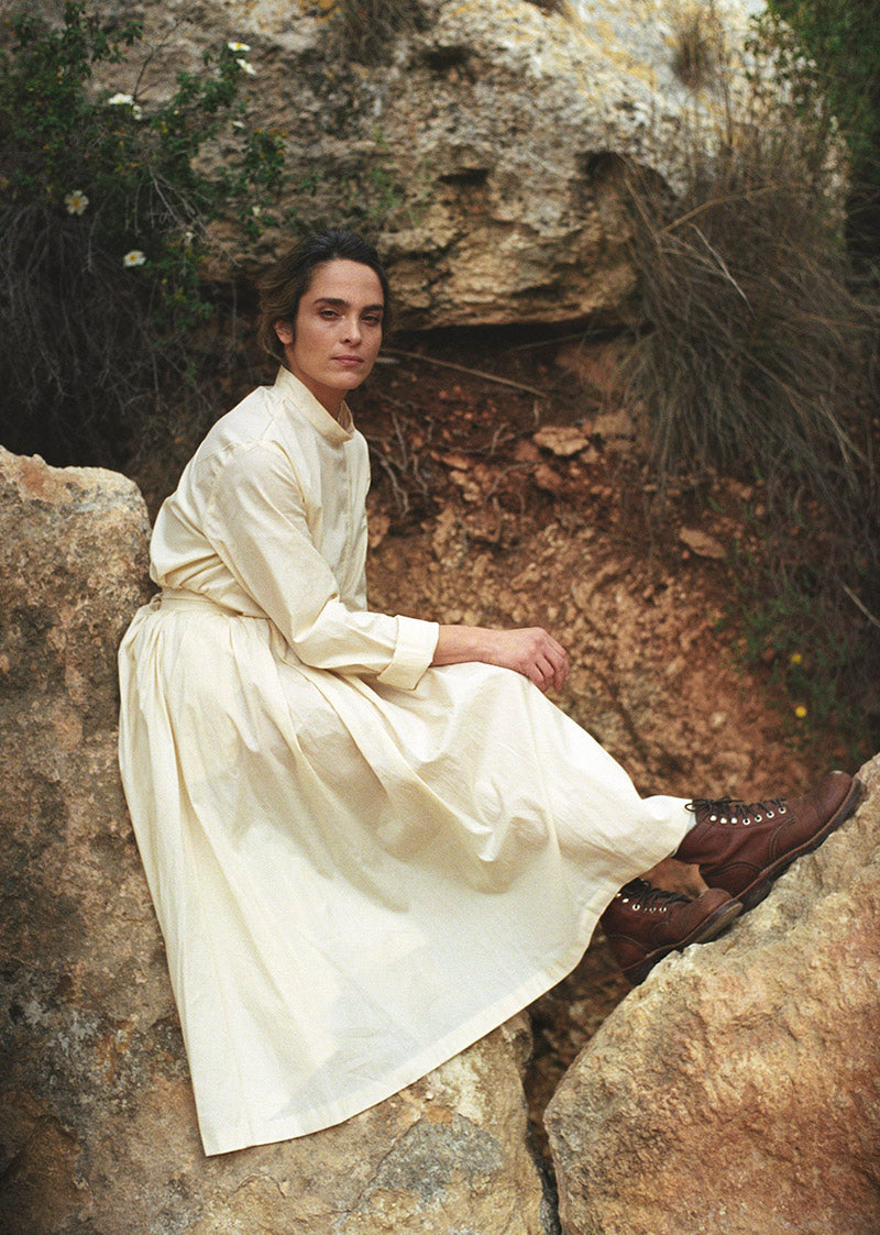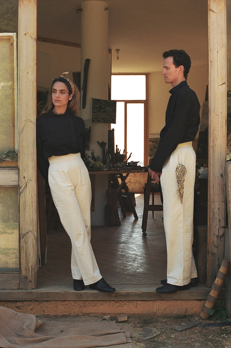 This collection is made mostly from vintage, locally manufactured fabrics, woven originally for the cheese, tent and bed linen industries in a small weaving factory in Rishon Le'Zion that is now defunct. All fabrics are 100% cotton, made particularly durable for extensive use. All items were sewn in small workshops around Tel-Aviv. The patterns were made based on workwear from Kushnir's archive: garments that arrived in the Middle East during the British mandate and with the spread of the socialist movement world-wide.