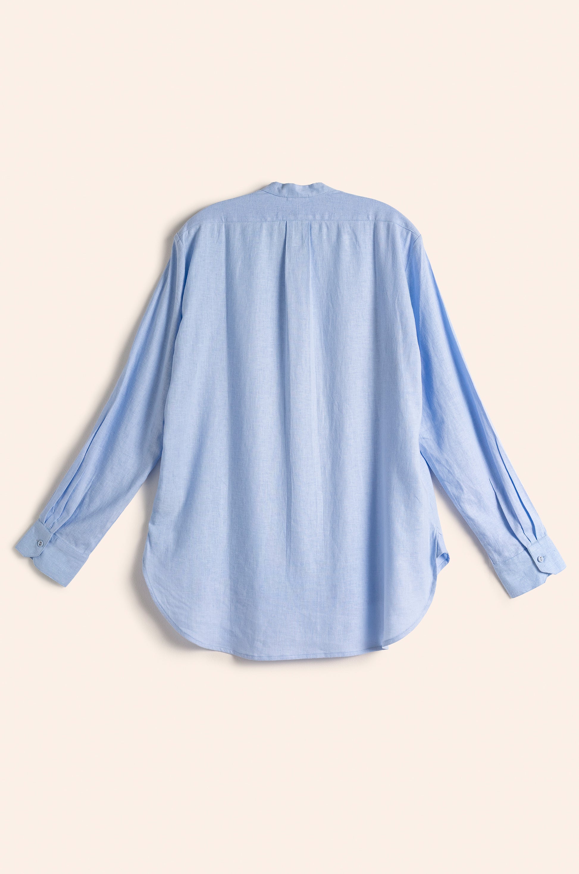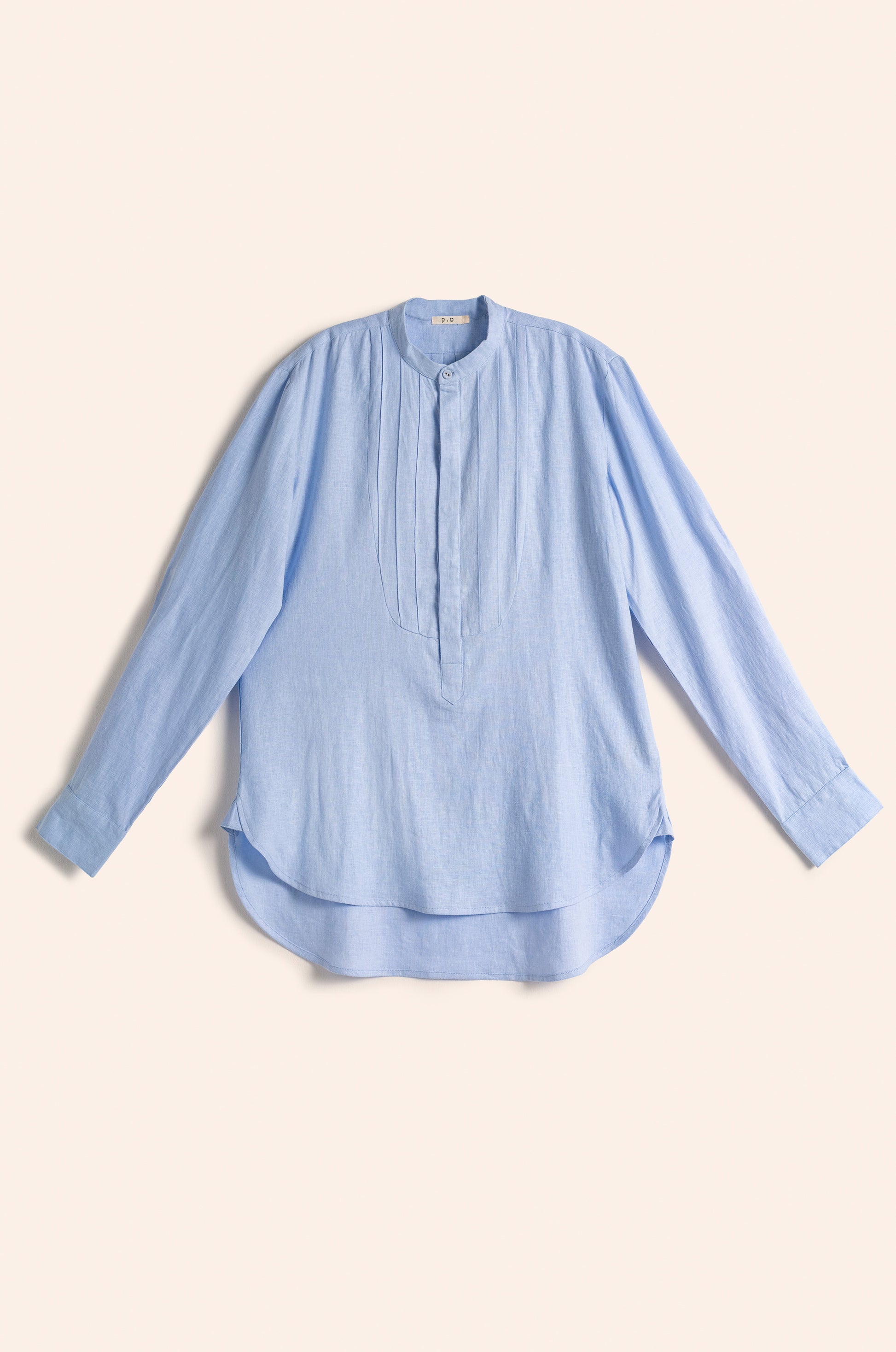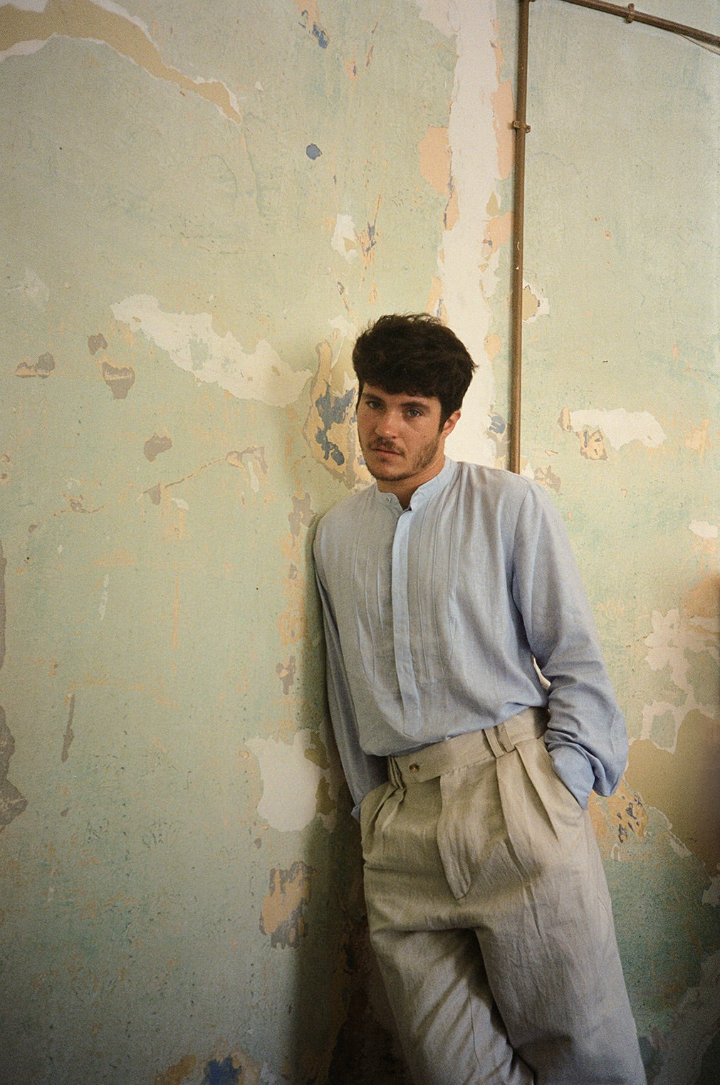 Based on a 1920s men's undershirt from our archive. The cut has been simplified and modernized. The Faux Tuxedo shirt is styled with a banded collar, a half placket with concealed buttons and a rounded hemline with a longer “tail” in the back.