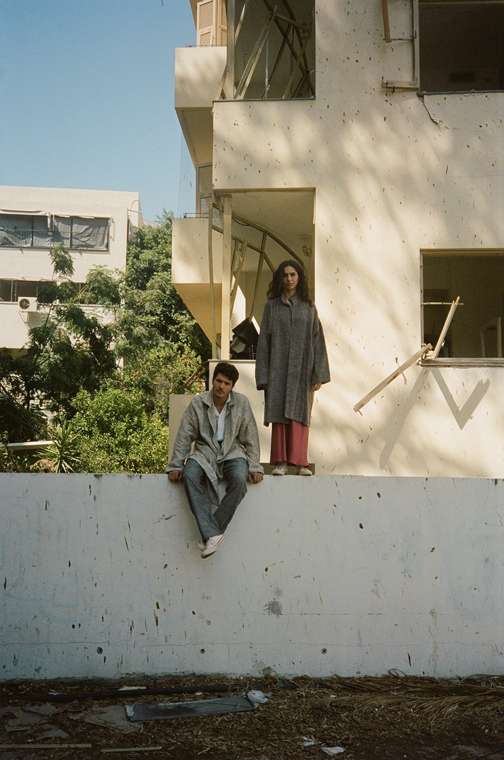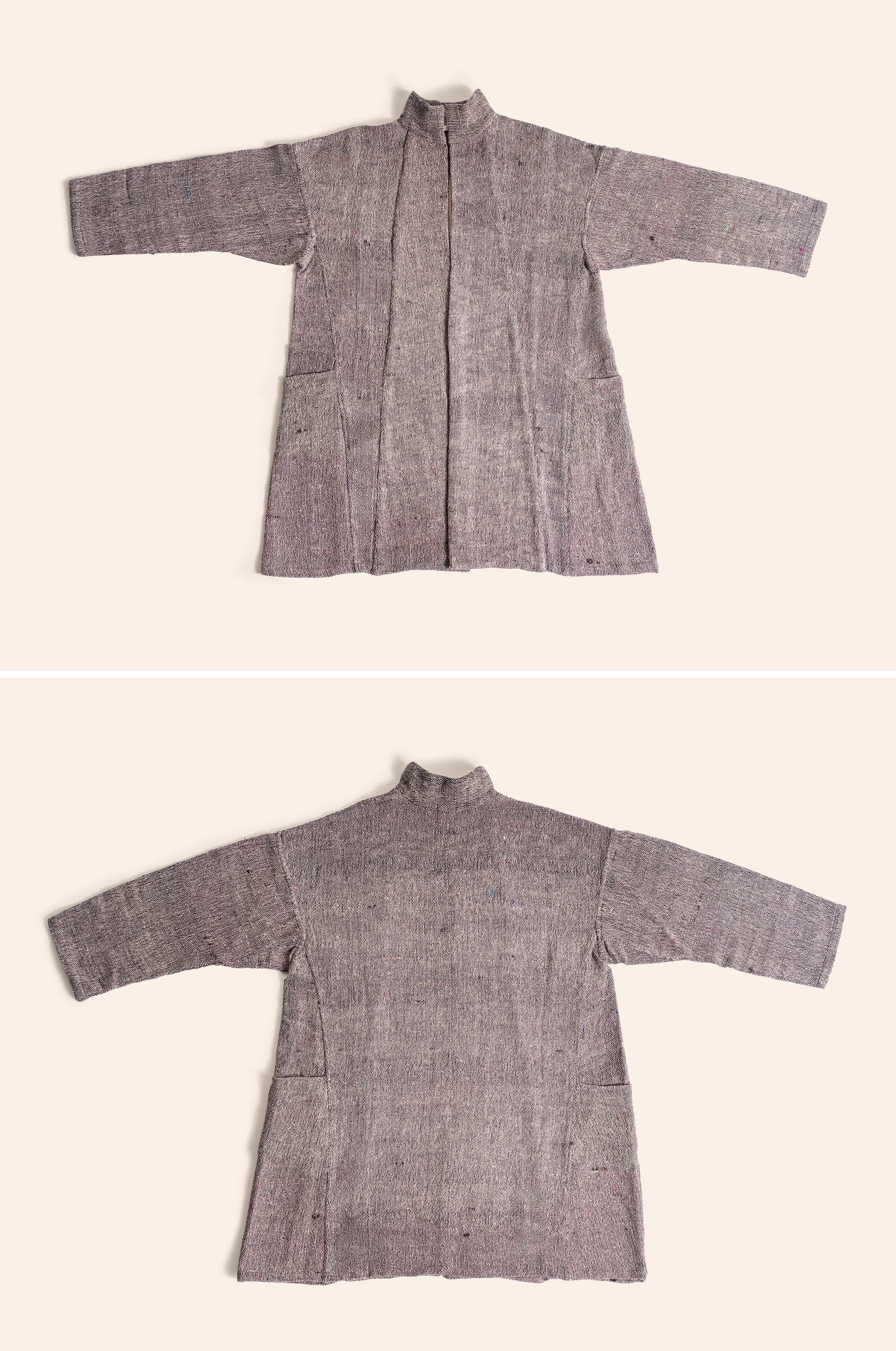 A relaxed, knee-length overcoat with deep pockets and a standing collar. This buttonless jacket combines a structured cut with soft fabric, creating a beautiful flow and drape. Available in one generous size that accommodates layering over bulky sweaters.