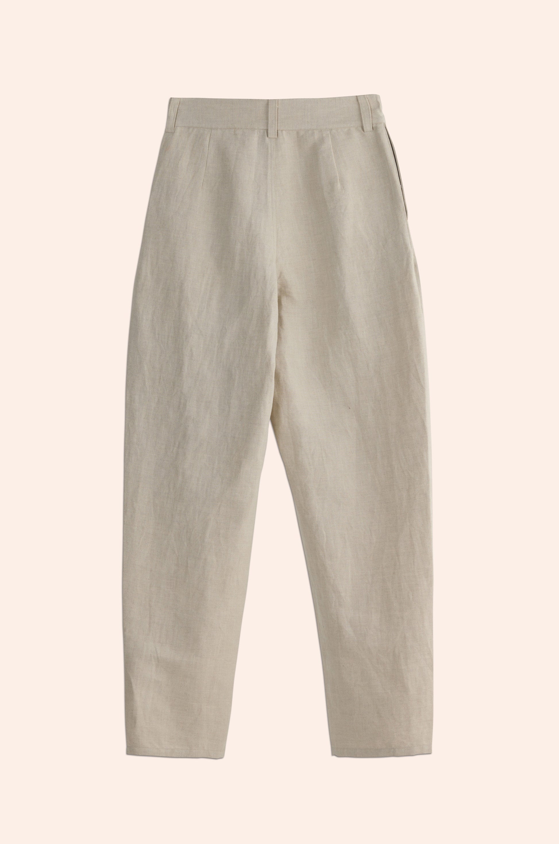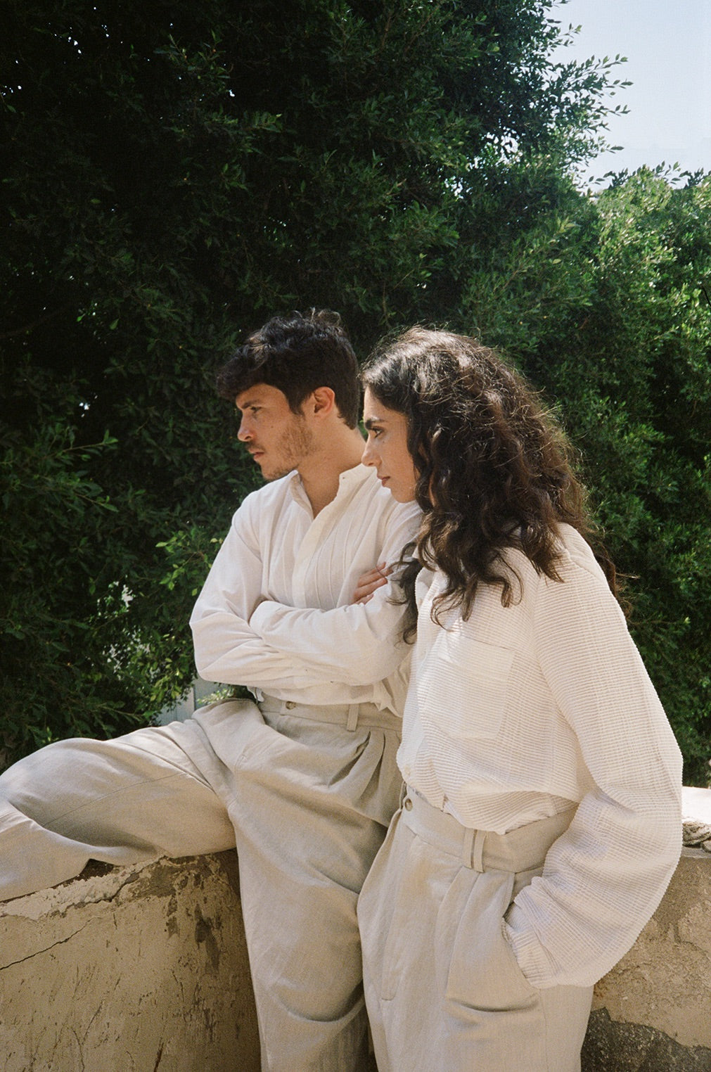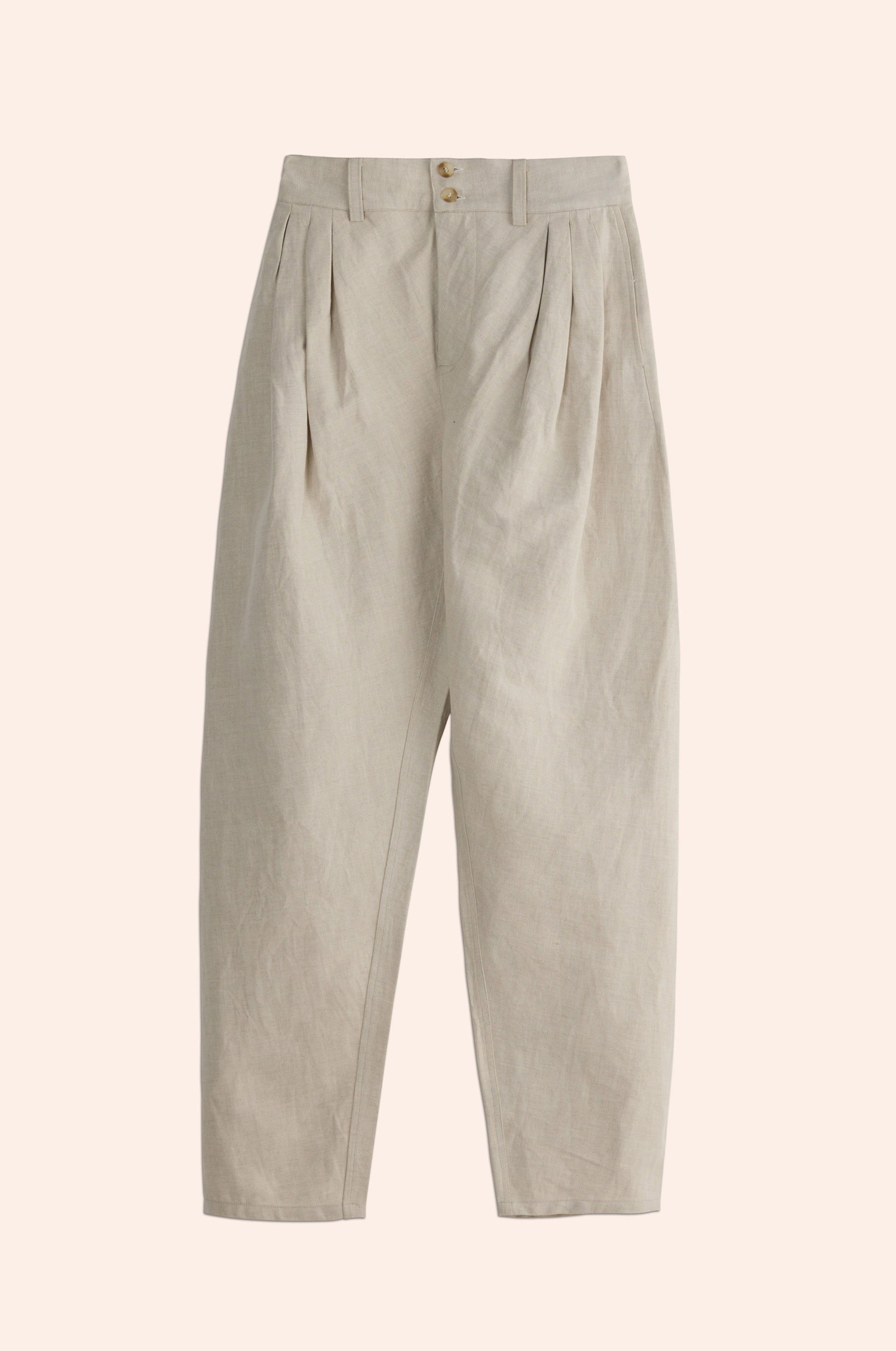 Mixing techniques of east and west cloths making, this cut is inspired by the first pants in history. They're constructed from two large pieces of fabric that wrap separately around each leg and are pleated together in the front. The result is a tailored, modern pant - but with no side seams. This originial structured silhouette has beautiful volume and ensures maximal movement . The belt is rounded to fit comfortably around the body.