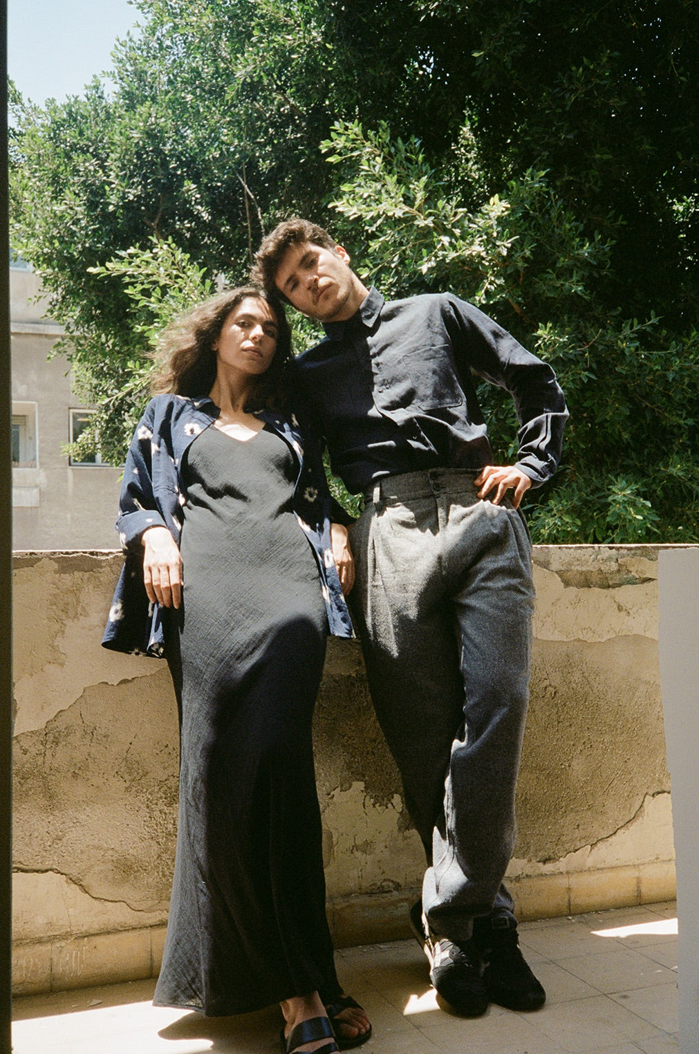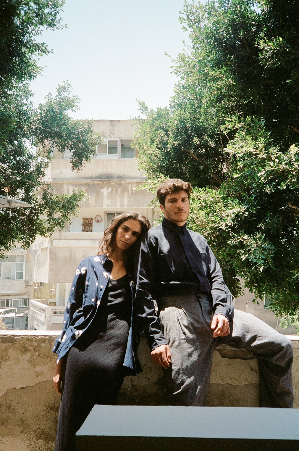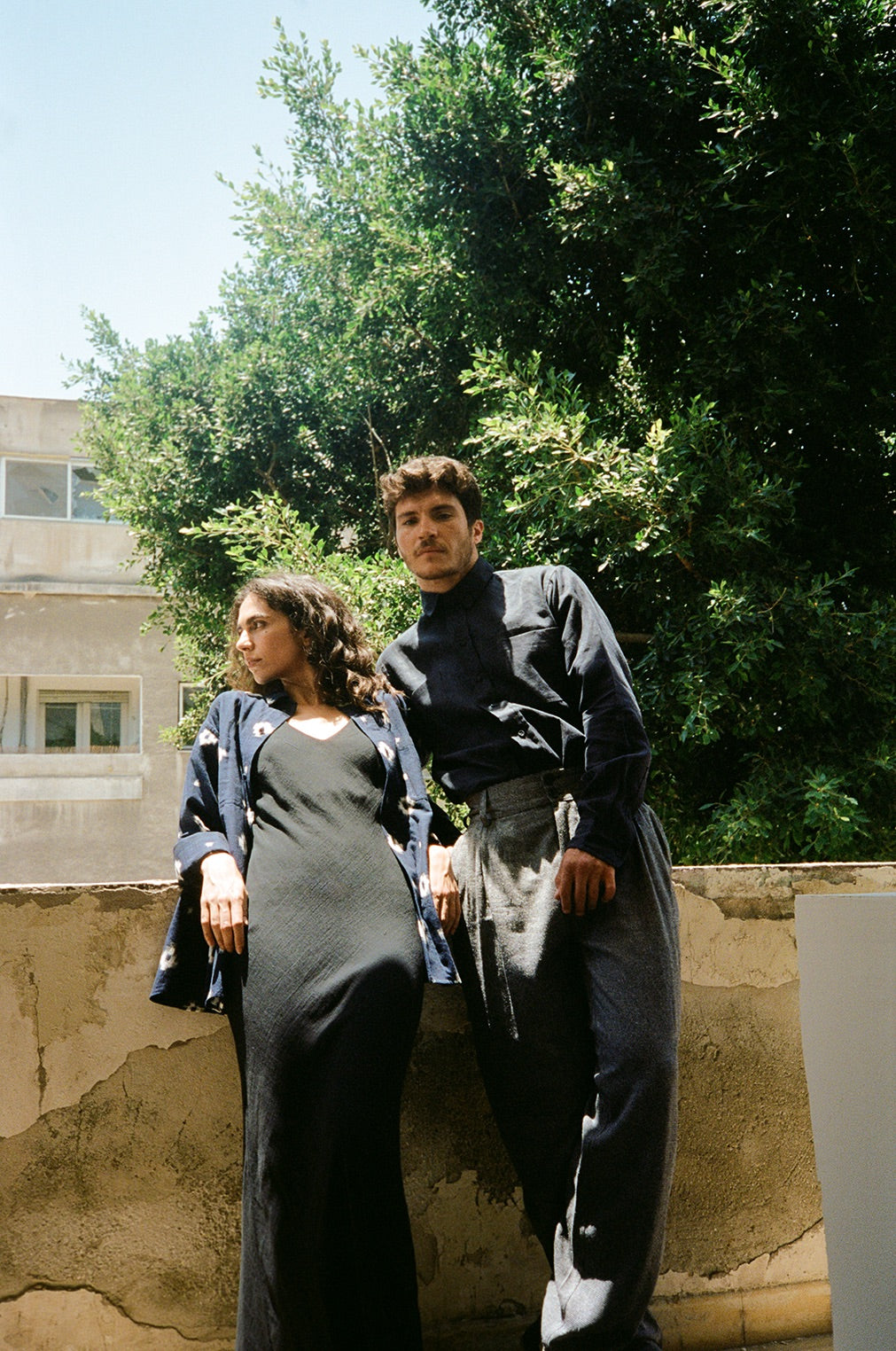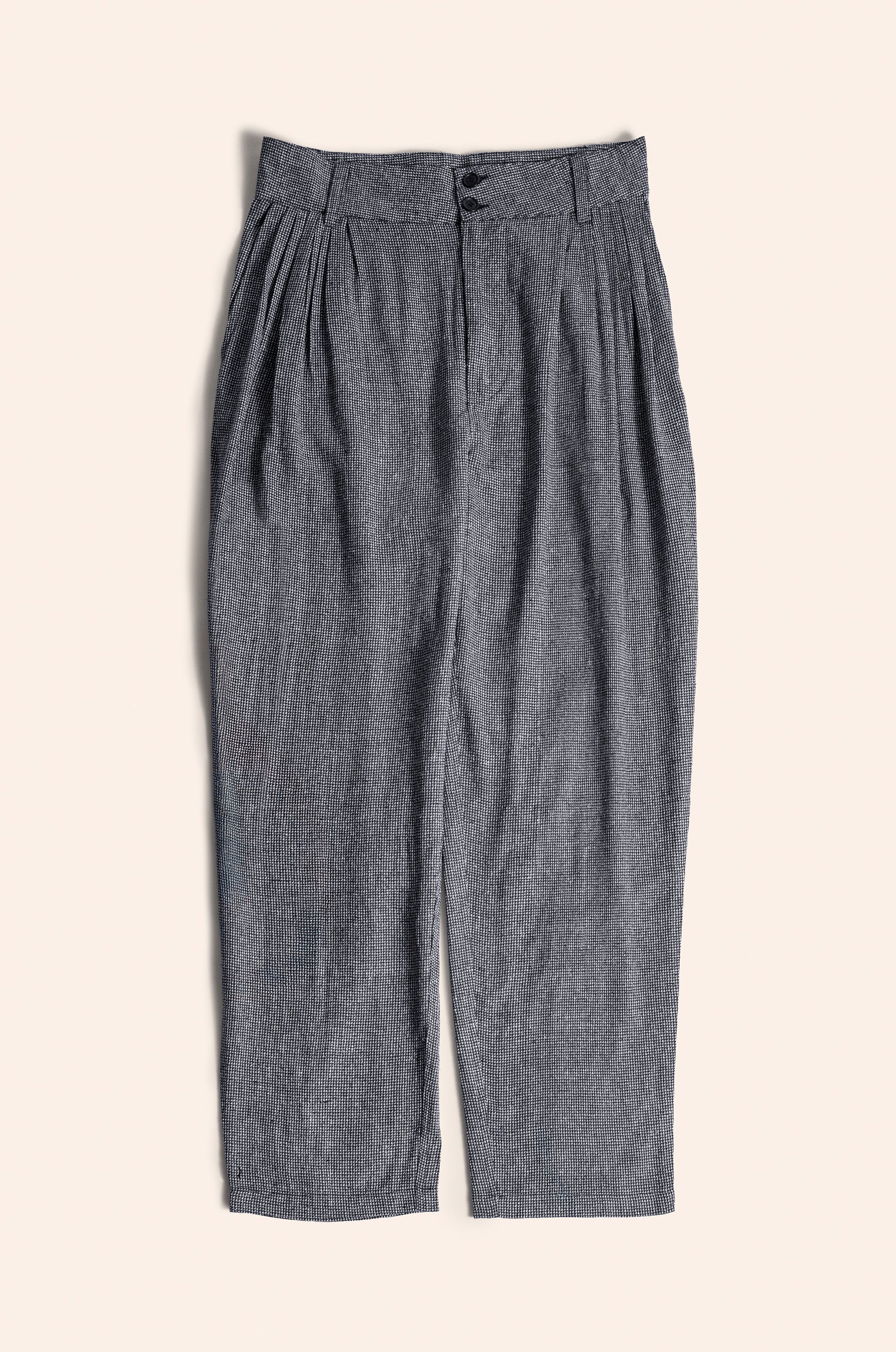 Named "Waves" for the shape of their intricate front pleats, these mid-waist pants follow a 1980s pattern from our archives and include a curved belt for maximal comfort and deep side pockets.